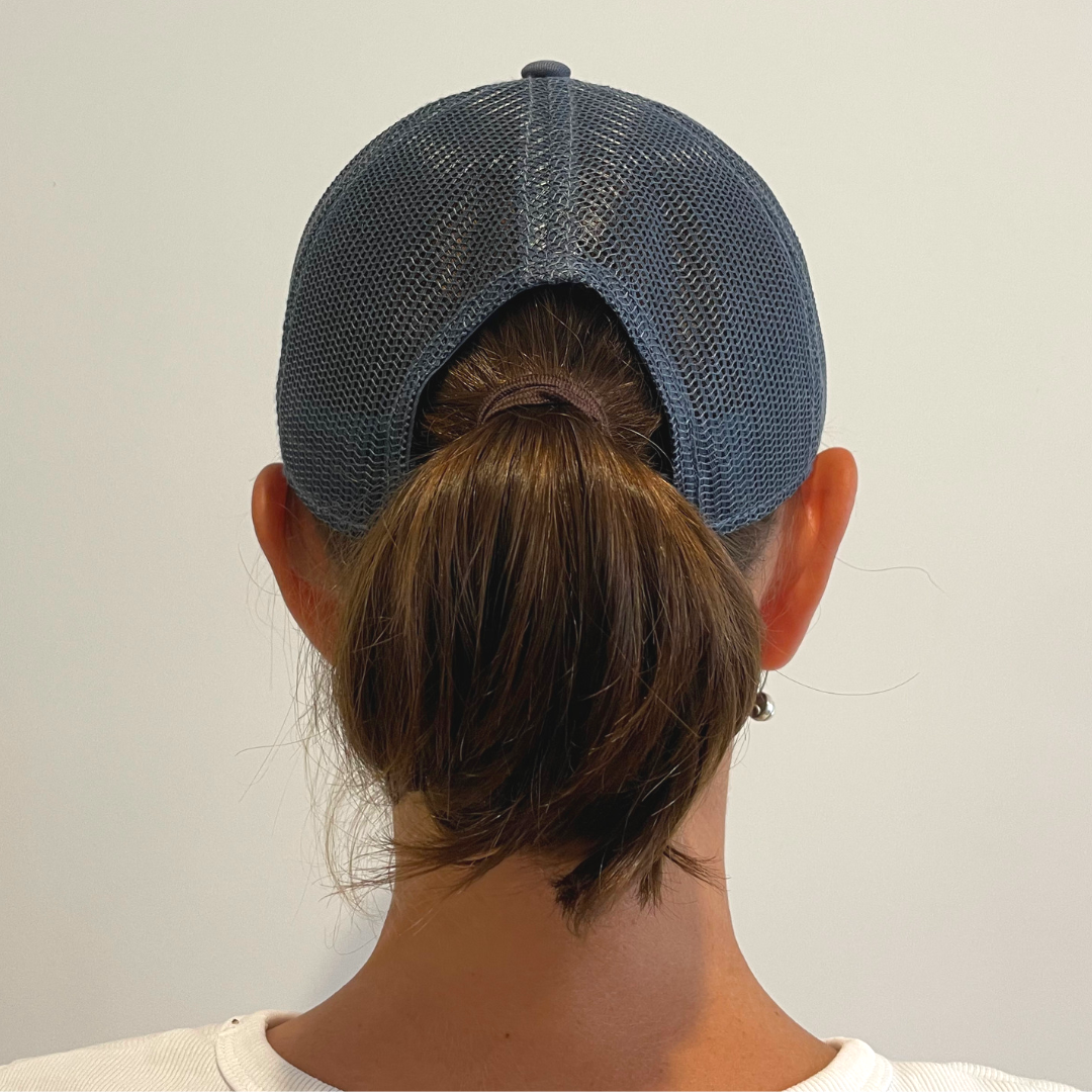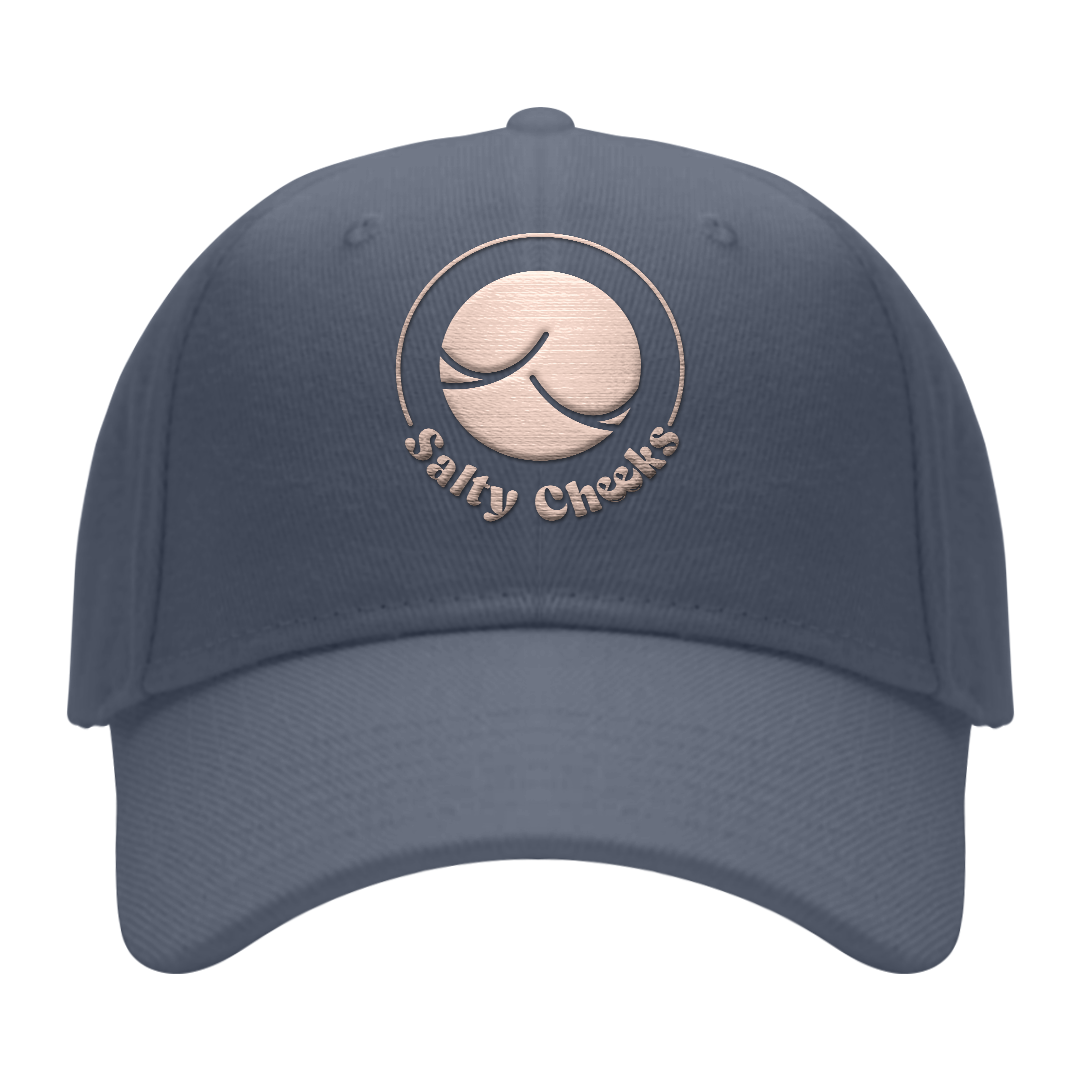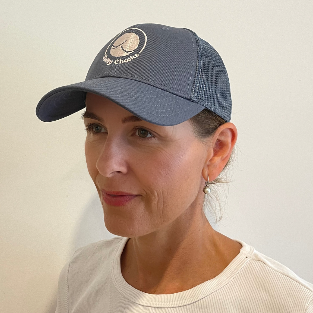 Salty Cheeks Trucker Cap - 100% cotton front and a firm pre-curved peak with breathable polyester mesh back at the rear. This is a lower profile trucker cap, perfect for those with a smaller head. It has an adjustable rear snap-closure so you can get the perfect fit and a ponytail opening for extra comfort. Keep your salty hair under control and look super-stylish when you get off the water.